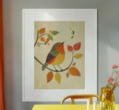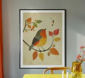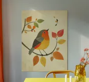 Uccello appollaiato su un ramo circondato da calde foglie autunnali poster