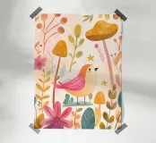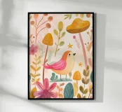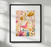 Un dolce uccellino rosa si trova tra funghi dorati e fiori soffici in questo giardino boho da sogno. Dipinta in calde tonalità di acquerello, l'opera d'arte fonde la dolcezza del capriccio e la calma della natura, perfetta per le pareti di asili nido, salotti accoglienti o per chiunque ami il fascino morbido e moderno delle fiabe. Portate un tocco di magia e serenità nel vostro spazio con questa stampa pastello del bosco.