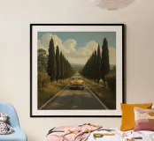 Un'auto d'epoca percorre una strada alberata sotto un cielo nuvoloso poster con telaio in legno