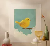 Un canarino siede con grazia su un ramo, circondato dal cielo blu poster con telaio in legno