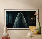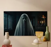 un fantasma spaventoso si trova in una stanza scarsamente illuminata e piena di ombre poster con telaio in legno