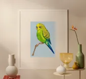 Un acquerello di un simpatico pappagallino verde, un pappagallo colorato.