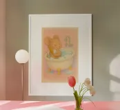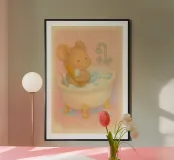 Un momento di puro relax: questa illustrazione, disegnata con amore, mostra un topolino che fa un bagno accogliente, con gli occhi chiusi, circondato da acqua calda e delicate bolle di sapone. Lo stile morbido dell'acquerello e i colori pastello conferiscono al motivo un'atmosfera calma e sicura, piena di leggerezza, e l'immagine parla della cura di sé, del benessere e dei piccoli momenti di felicità nella vita quotidiana. Giocoso e rilassante, invita a fermarsi e ad assaporare il momento.