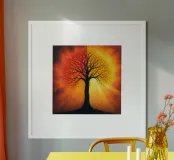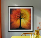 Una splendida silhouette di un albero su uno sfondo luminoso e caldo. poster con telaio in plastica