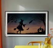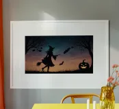 Al calare del crepuscolo, una strega in silhouette vola a cavallo della sua scopa tra i pipistrelli, con una zucca incandescente in primo piano, creando un'atmosfera incantevole.
