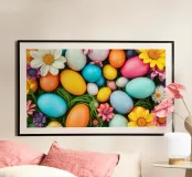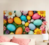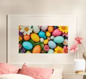Uova di Pasqua colorate e fiori disposti in una vivace atmosfera primaverile poster con telaio in alluminio