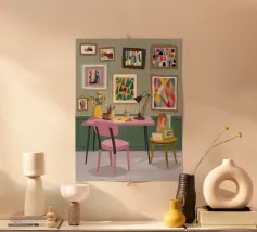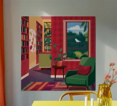 Un interno moderno ed elegante viene visto da un'altra stanza, mostrando un vibrante gioco di colori, mobili contemporanei e arte, creando una scena sofisticata e stratificata.