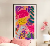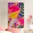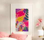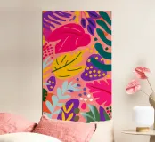 A vertical abstract botanical composition showcasing large, stylized leaves and floral shapes. The artwork is characterized by a dynamic and energetic arrangement of vibrant pink, yellow, orange, and dark green or blue forms.