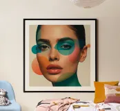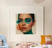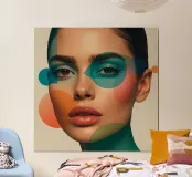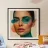 Volto di donna con forme geometriche e trucco verde acqua poster con telaio in alluminio