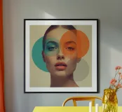 Volto di donna con sovrapposizione di cerchi colorati traslucidi poster con telaio in alluminio
