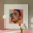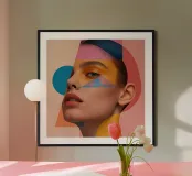 Volto di donna con sovrapposizioni di forme geometriche e colori brillanti poster con telaio in legno