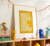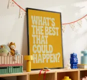 Design tipografico giocoso con la scritta "WHAT'S THE BEST THAT COULD HAPPEN?" in grandi lettere sans-serif arrotondate color crema su sfondo arancione. Le lettere chiare e spesse creano una dichiarazione moderna e accattivante.