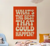 Design tipografico giocoso con la scritta "WHAT'S THE BEST THAT COULD HAPPEN?" in grandi lettere arrotondate color crema su sfondo arancione. Le lettere spesse e leggermente inclinate creano dinamismo, cordialità e una dichiarazione moderna e accattivante.