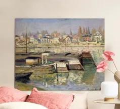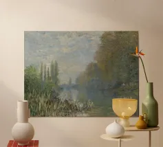This tranquil winter landscape on the riverbank shows a snow-covered promenade with walkers, gentle hills and a quiet expanse under a bright winter sky. The subtle shades of blue, grey and white create a minimalist winter atmosphere full of lightness and tranquillity. The scene combines a river landscape in winter, romantic nature illustration, Scandinavian winter aesthetics, timeless landscape art, a walk by the water in the snow and tranquil nature motifs. Ideal as a winter mural, modern wall art, cosy home decor, nature decoration for the living room, art for nature lovers.