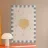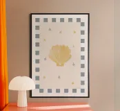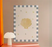 A cute watercolor yellow seashell surrounded by yellow and blue stars, with a trendy white and blue frame.