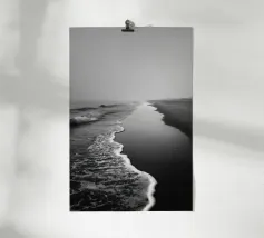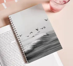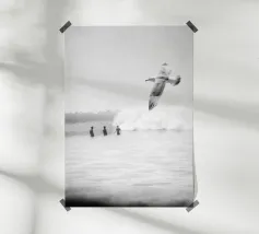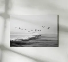 Una suggestiva fotografia in bianco e nero che immortala uno stormo di gabbiani che si libra con grazia sopra le potenti onde dell'oceano. I toni ad alto contrasto creano una scena costiera drammatica ma serena, perfetta per un arredamento elegante e minimalista.