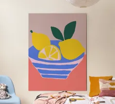 Two yellow pears rest in a pink and white zigzag-patterned bowl, with a bold yellow and dark background creating a high-contrast, graphic still life.