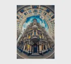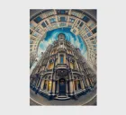 A mesmerizing Victorian-style building is surrounded by a circular urban landscape. Illuminated windows contrast against the swirling, starry night sky, creating an enchanting and surreal atmosphere. The intricate architectural details add elegance and mystery.