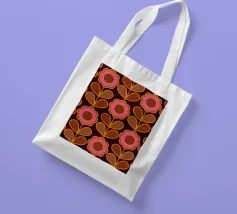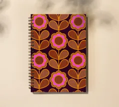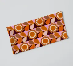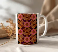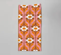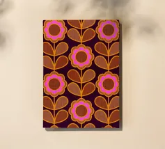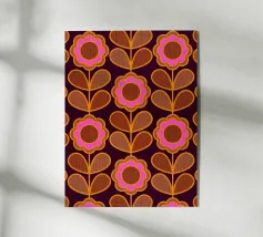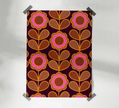Fate una dichiarazione con questo audace motivo floreale mid-mod. Margherite astratte su steli frondosi sono reimmaginate in uno stile grafico retrò, con accenti rosa, marrone terra e ocra su uno sfondo viola intenso.