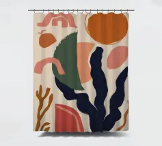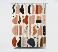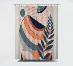 Una moderna composizione astratta di varie forme botaniche stilizzate e foglie in una tavolozza di terracotta, beige e blu scuro su uno sfondo chiaro.