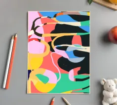 A bold and modern abstract composition features a dynamic arrangement of overlapping shapes in pink, navy blue, and black, with textured details creating a sophisticated and graphic piece.