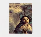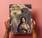 An elaborately dressed woman is depicted in front of an elephant, surrounded by pink lotus flowers. The scene conveys a sense of serenity and connection with nature, emphasizing cultural and spiritual elements.