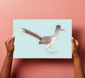 A pencil drawing in coloured pencils of a greater roadrunner. You can see the bird from the side, so that its long tail is nicely in the picture.