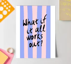 Infondete nel vostro spazio un ottimismo retrò con questa accattivante stampa tipografica. La frase stimolante "What if it All Works Out" (E se tutto andasse bene) è riportata in vivaci caratteri 3D gialli e neri su un rilassante sfondo turchese pastello. Questo mix unico di stile vintage e colore moderno crea un impatto visivo sorprendente. Perfetto per uffici, soggiorni o qualsiasi area in cui sia necessaria una dose quotidiana di positività. Il design retrò aggiunge un tocco di nostalgia, mentre il messaggio edificante incoraggia una prospettiva di speranza. Un regalo ideale per i sognatori e per chi ha voglia di fare, questa stampa farà sicuramente parlare di sé.