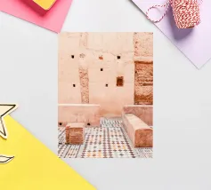 Entrate nel cuore di Marrakech con questa affascinante fotografia di un interno di un riad verde e lussureggiante. Il verde intenso e gli intricati dettagli architettonici creano un'oasi di tranquillità, dove il design tradizionale marocchino incontra la bellezza naturale. Intorno alla piscina del cortile scendono a cascata ricche piante, le cui foglie vibranti contrastano con gli eleganti pavimenti piastrellati. Questa immagine evoca la calma e il fascino di un rifugio marocchino, dove la frenesia della città svanisce e si viene avvolti da una fuga pacifica e verdeggiante.