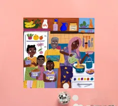 Questa opera d'arte mostra una persona seduta su una sedia a righe, circondata da girasoli e da una borsa verde. Lo sfondo è di un marrone tenue che crea un'atmosfera rustica e riflessiva.