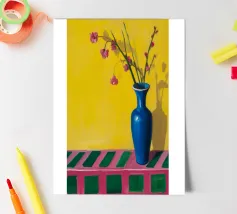 Una vivace serie di fiori di campo colorati disposti in un vaso blu. Lo sfondo è di un rosa strutturato e modellato, creando una composizione ricca e gioiosa, piena di vita e di colore.