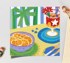 Un patchwork astratto di forme dipinte e strutturate in una tavolozza tenue di blu, ocra e beige crea una composizione sofisticata e ben bilanciata con un tocco artistico e artigianale.