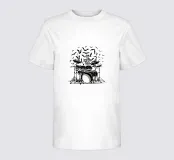 Illustrazione di uno scheletro percussionista che suona una batteria, in una tavolozza nera e grigia con accenti bianchi. Uno stile scuro e diretto, ideale per magliette rock e goth e abbigliamento dark.
