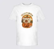 Animale capibara super carino seduto nella zucca intagliata di Halloween con un arcobaleno arancione, fiori, testo in stile autunnale citazione Ciao Zucca