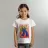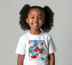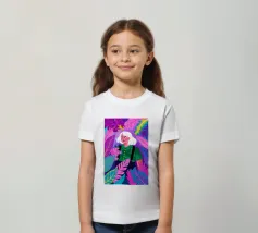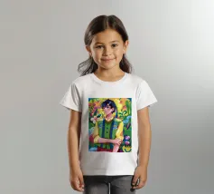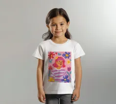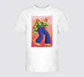 This artwork depicts a person in a vibrant yellow floral top and blue pants, striking a dynamic pose against a pink background with orange floral patterns.