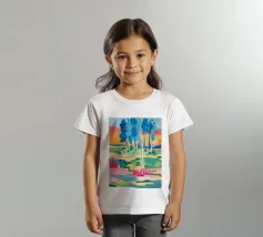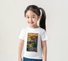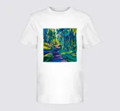 An expressive, painterly landscape of a path alongside a stream flowing through a forest. The vibrant blues, greens, and yellows create a dynamic, beautiful, and slightly abstract depiction of a walk in nature.