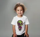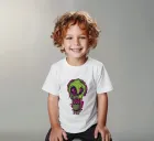 Un'illustrazione digitale vibrante e surreale di un teschio alieno che si fonde con una lampadina gocciolante, caratterizzata da colori verde neon e magenta su uno sfondo viola scuro. Il design inquietante e gocciolante combina l'estetica horror e fantascientifica.