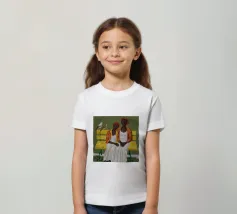 This artwork shows a person sitting on a striped chair, surrounded by sunflowers and a green bag. The background is a muted brown, creating a rustic and reflective atmosphere.