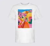 Una vivace scena di strada con edifici colorati e una scalinata rosa acceso che sale verso l'alto, evocando una vivace città costiera mediterranea o italiana.