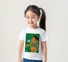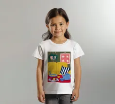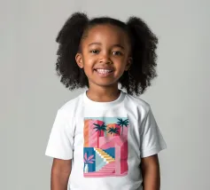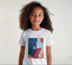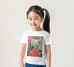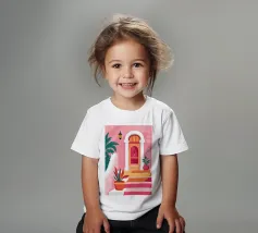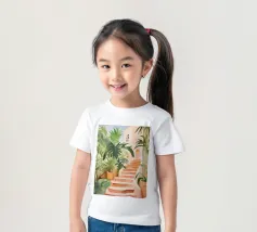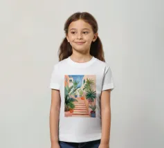 Scale rosse e vivaci conducono attraverso un edificio colorato e semplificato verso un lussureggiante ingresso ad arco, suggerendo un viaggio verso una destinazione bella ed esotica.