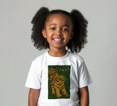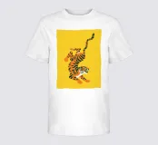 Una tigre stilizzata è raffigurata in una posa dinamica e giocosa. Le strisce arancioni e nere della tigre spiccano con forza, creando un contrasto visivo di grande effetto.