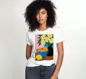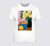 Un'elegante e semplice natura morta con un bouquet di fiori gialli in un vaso scuro accanto a una ciotola blu profondo piena di arance fresche. La composizione è serena e senza tempo, con un bel contrasto di colori.
