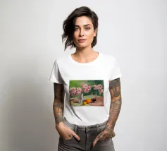 Un'audace natura morta con vivaci fiori rosso-rosa, forse papaveri o gerani, in un semplice vaso, accanto a fresche pere verdi, il tutto su una ricca tovaglia rossa che contrasta nettamente con uno sfondo blu intenso.