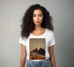 Questa illustrazione digitale cattura l'audace discesa di due coraggiosi paracadutisti su un paesaggio desertico rosso e alieno. Il terreno sottostante è una vasta e arida distesa di dune di sabbia cremisi.