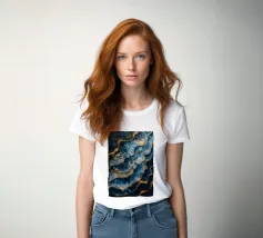 Una composizione astratta che mostra onde dinamiche di oro e argento, intrecciate con spruzzi vibranti su uno sfondo blu profondo, ideale per sfondi desktop e sfondi artistici.