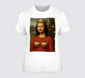 Monna Lisa indossa un buffo maglione natalizio e un cappello con corona di carta natalizia. Sul suo pullover natalizio ci sono due pudding natalizi e un albero di Natale alle sue spalle.