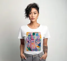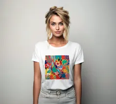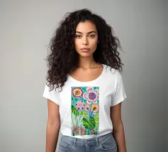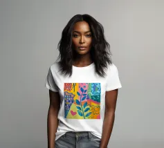 Una vibrante e intricata composizione astratta che ricorda una trapunta patchwork, con pannelli distinti pieni di foglie stilizzate, elementi floreali e motivi astratti in una ricca gamma di colori. La disposizione organizzata e giocosa crea un senso di artigianalità.