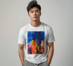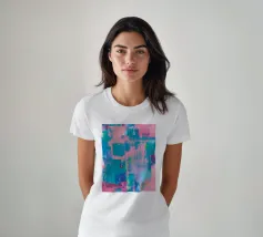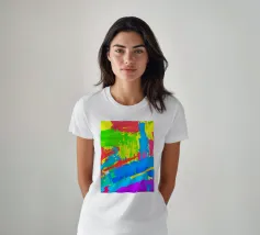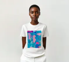 Le vibranti tonalità di rosa, blu e turchese si fondono in un vivace disegno astratto, creando un senso di movimento ed energia. I tratti audaci e i colori stratificati evocano un'atmosfera dinamica ed espressiva.