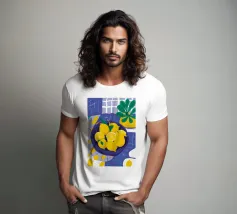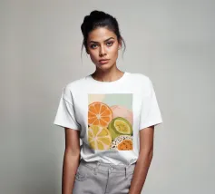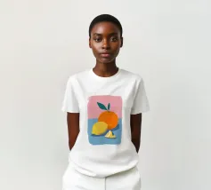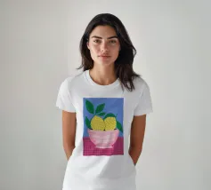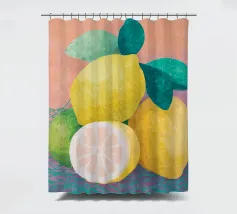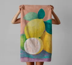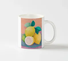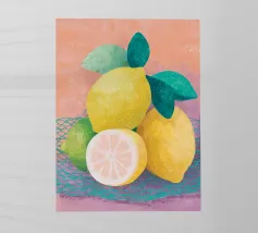 Una natura morta mediterranea con limoni e foglie verdi in tenui colori pastello è presentata in un motivo grafico a quadri. Questa illustrazione di ispirazione vintage dona un tocco di estate tropicale a qualsiasi cucina e celebra la freschezza di frutta e verdura biologica.