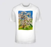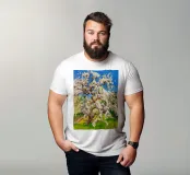 Un magnifico albero è ricoperto da una profusione di fiori bianchi o color avorio, i cui rami creano un bellissimo disegno intricato contro un cielo blu brillante, celebrando il culmine della primavera.